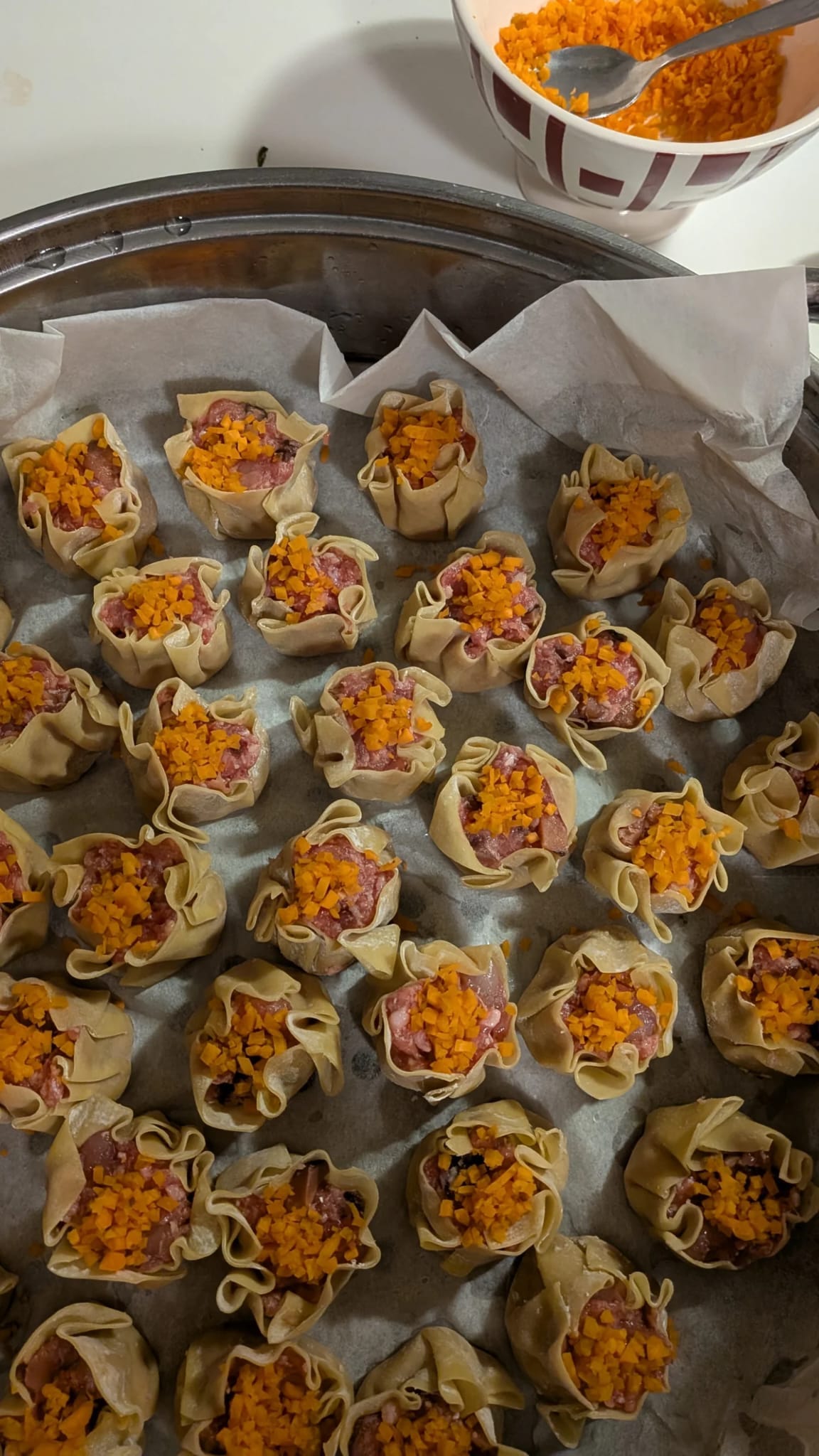 I also had a Christmas potluck at my school and, because I commute by bike, I wanted to bring something that was easy to transport. I also wanted to share a dish that reflected my culture, so I thought steamed dumplings! Siu mai 烧卖 are a classic. These are traditionally pork and prawn dumplings, known for their distinctive open-face appearance, but I made them with beef mince instead on account of my Muslim classmates. Usually a little tobiko (flying fish roe) is sprinkled over the top of each as garnish, though I used very finely chopped carrot and think it looked as beautiful. To accompany the dumplings, this peanut sauce (with a couple spoonfuls of chilli oil mixed in) was delicious!