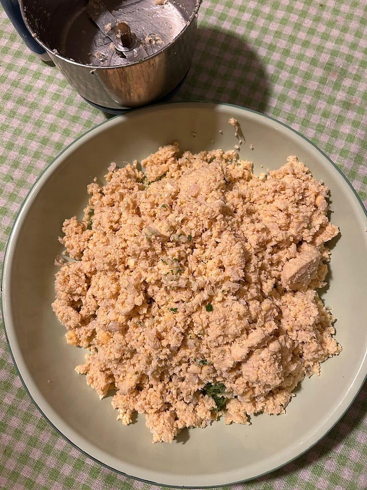 Finely grind the chickpeas. It should feel as soft, loose, and grainy as cooked couscous. Be wary of grinding the chickpeas to a paste — you’re not making hummus here! Little pulses are key.